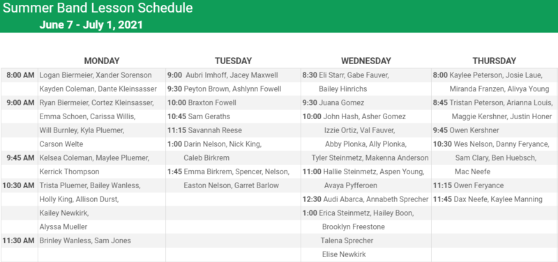 Summer Band Lesson Schedule