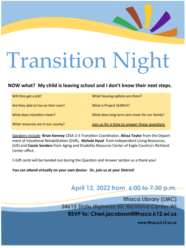 The Richland County and Community on Transition, (CCoT) will be presenting a virtual Transition Night on Wednesday, April 13 from 6:00 to 7:30 p.m. in conjunction with the Ithaca School District. This presentation is geared for parents and guardians who have a child with a disability age 12 and beyond, who would like to learn more about services available as their child transitions from school to post-secondary options.