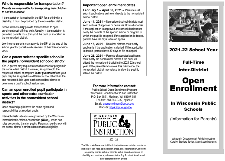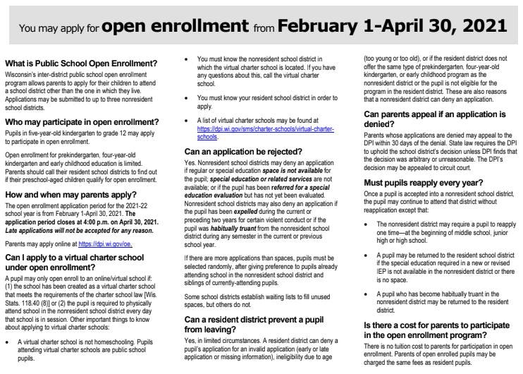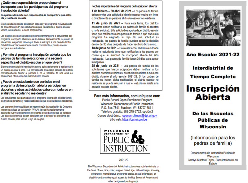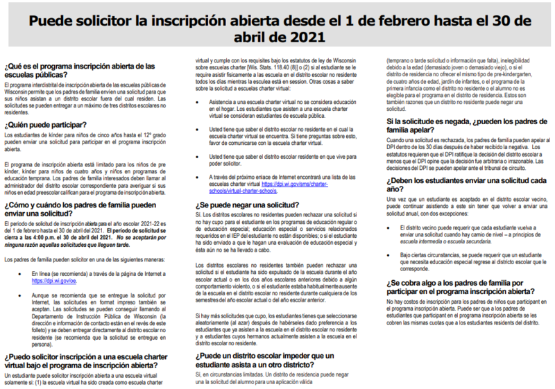 ¡Se acerca la inscripción abierta para el año escolar 2021-2022! El período de solicitud comienza el 1 de febrero y termina el 30 de abril de 2021. El portal de solicitud NO abre hasta el 1 de febrero de 2021. Hay un enlace a la solicitud del DPI y la información de inscripción. https://dpi.wi.gov/open-enrollment?rdt=oe. Las instrucciones y los formularios en español también se encuentran en el mismo enlace del sitio web del DPI.